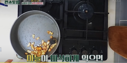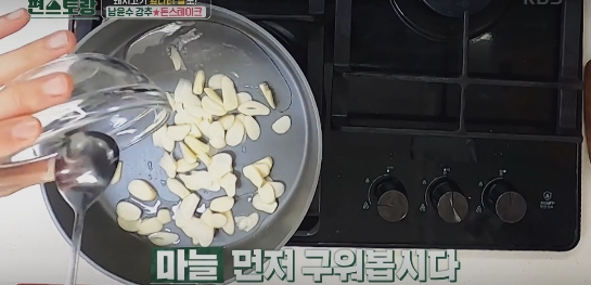 3) 마늘을 먼저 굽고 바삭하게 익으면 잠시 따로 보관한다.