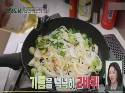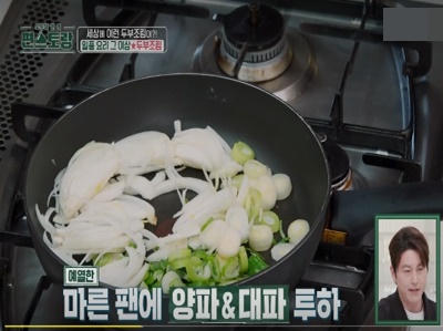 4. 예열한 팬에 기름없이 양파와 대파를 넣고 강불로 2~3분 굽는다.